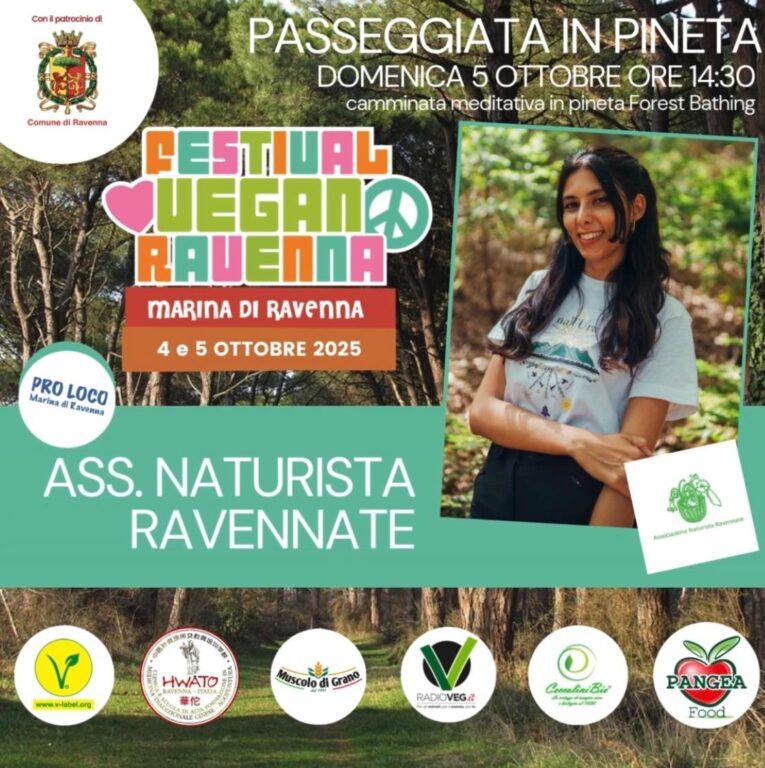 Camminata meditativa nella pineta di Marina di Ravenna, a cura di Lucia Costa. L’evento, a offerta libera consapevole, si terrà domenica 5 ottobre alle 14.30, all’interno del Festival Vegan Ravenna. Ritrovo alle ore 14.00 al banchetto dell’Associazione Naturista Ravennate.